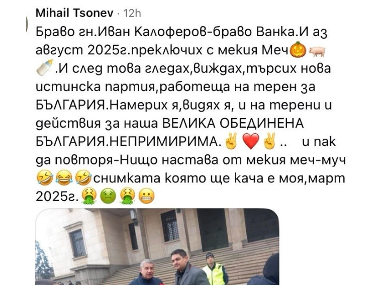Под поста във фейсбук на Иван Калоферов, Михаил Цонев го поздравява за избора и споделя, че той също е напуснал ПП МЕЧ през август 2025 г.